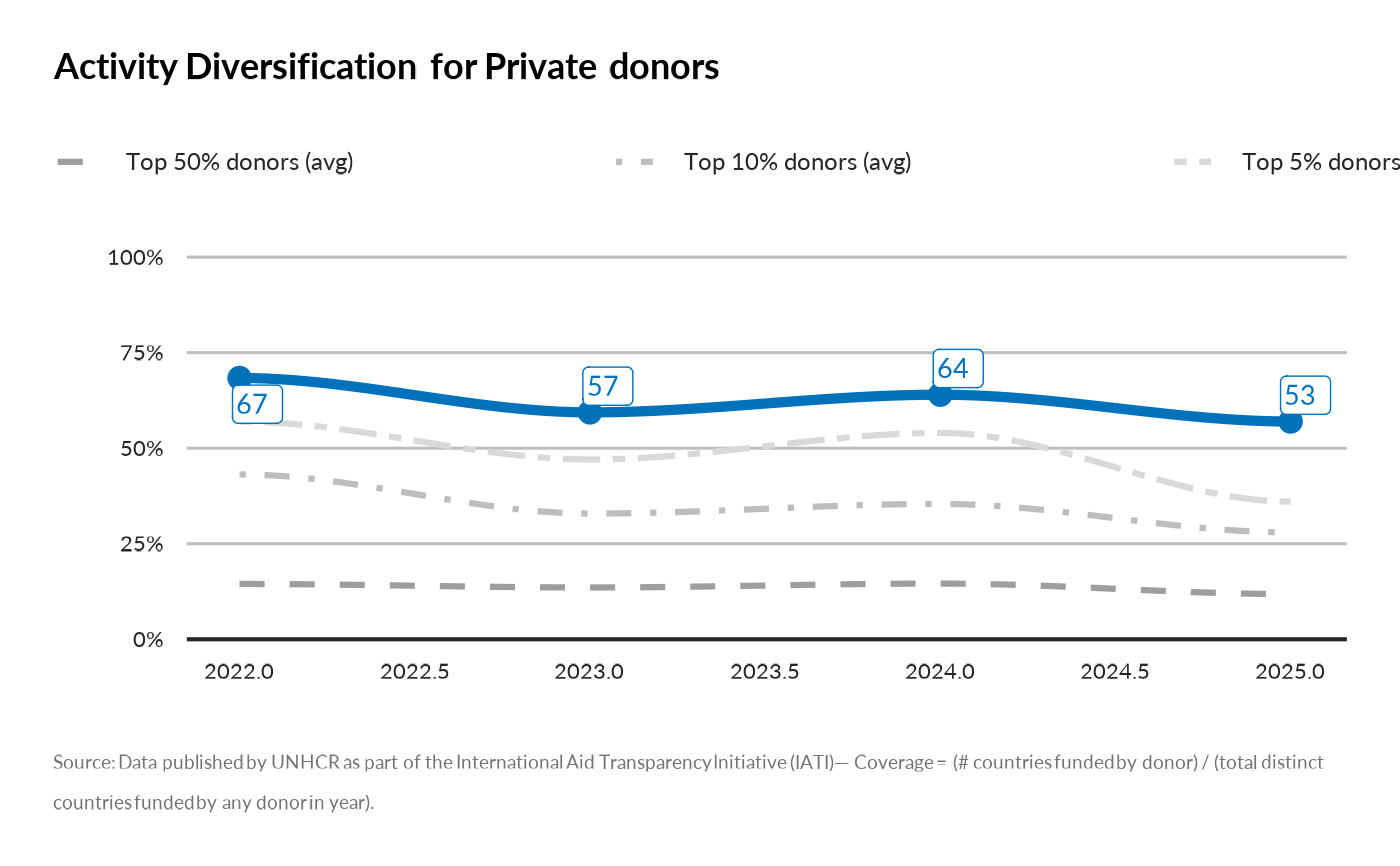 show_donor_activity_diversification.RdShows the ** Adds three benchmark lines: the **average** coverage (per year) for donors ranked by annual funding in the **Top 5 The donor’s path uses **geom_smooth(method = "loess", se = FALSE)** instead of a straight line, with **points** and **`ggrepel` labels** (absolute # of countries) for the donor only.